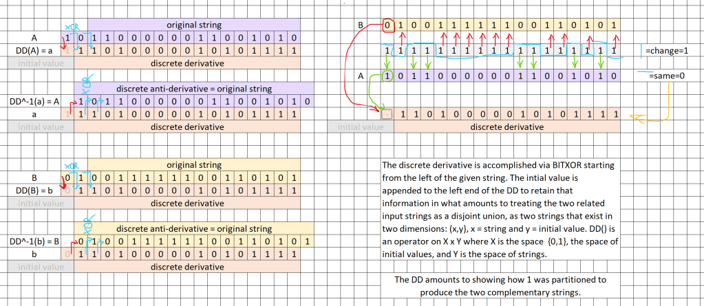 Below are clips of an Excel file that gives a definition of the discrete derivative via an algorithm by which it operates on an infinite binary string….by what it does to an individual string. It also shows how the anti-derivative operates. The discrete derivative is the operator that yields Gray’s code used in porting analog to digital.