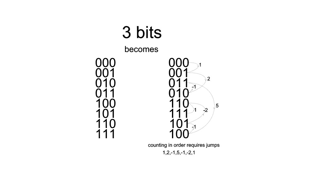 1st sequence 1 > 2 > -1, then reverse…-1 > -2 > 1 then append (or the fancier word: concatenate) with the big jump in between….1 >2 >-1 > 5 > -1 > -2 > 1. The big jump is given by the difference between the number of total jumps in the list (always 1 less than the number of entries in the list) and the sum of the jumps in the sequence from the previous shorter list. In the 3-bit case there are 8 entries -> 7 jumps and the sum from the 2-bit case was 2…1 + 2 + (-1) = 2… so we find the big jump in the 3-bit list is 5.