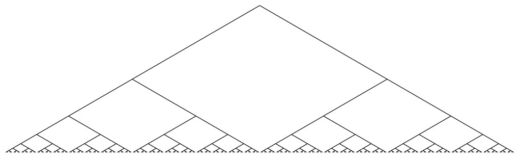 We next consider what labels we want to apply to the vertices and by extension to the “leaves” of the tree…the limits of an infinite tree….the points on the horizon. The most basic labels are those given by counting in binary starting at 1 on the right side (for the moment think of [e] as being 0), then labeling the left side by complementing the labels from the right side. The labels (count) on the right and the complement on the left have distinct roles in the structure of the tree and in the resulting set of binary strings.